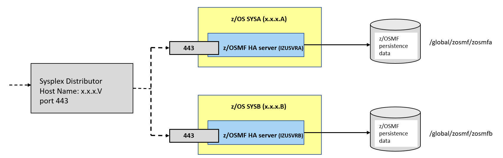 Both z/OSMF servers are bound to the DVIPA x.x.x.V. With both z/OS systems active in the Sysplex, the preferred z/OSMF server, SYSA receives all new incoming requests.